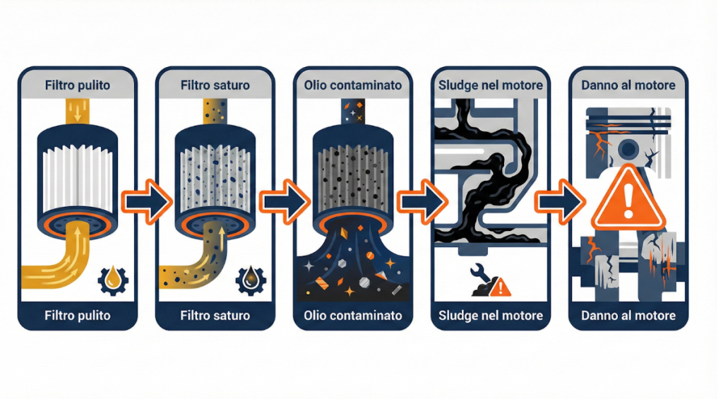 Die Infografik veranschaulicht den schleichenden Prozess: Sauberer Filter → Gesättigter Filter → Verunreinigtes Öl → Ölschlamm im Motor → Motorschaden. Ein Prozess, den man weder sieht noch hört – bis es zu spät ist.
